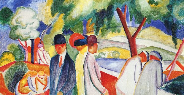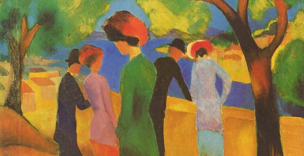 Im Werk des reiferen August Macke zeigen sich ab und an auch düstere Farben. In dieser Phase kristallisierten sich auch die Lieblingsmotive von Macke heraus. Es sind Spaziergänger, einsam wirkende Gestalten und Tiere. Im Jahre 1911 stellt August Macke zum ersten Mal auf der Ausstellung des "Blauen Reiter" in einer Münchner Galerie aus. Es folgen außerdem weitere Beteiligungen an wichtigen kunsthistorischen Ausstellungen, wie dem "Ersten Deutschen Herbstsalon".