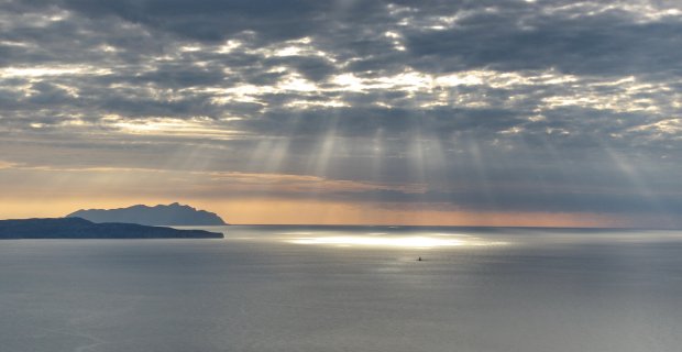 Hier spielt die Farbgebung eine wichtige Rolle. Häufig ist der Himmel in Blau- und Grautönen gehalten und wirkt damit kühl. Sonnenauf- oder Untergänge dagegen haben eine rötlich- orange Grundstimmung und wirken damit wärmer.